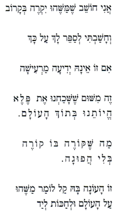 והפנים הן מנהרה שלא ניתן לדעת לכיוונה וקמטי המצח הם תמרורי האזהרה והלחיים הסדוקות הן המהמורות של כביש עכו-צפת והשפתיים המחורצות הן הדרך הביתה. אני פאלח בחולצה משובצת עם אצבעות גסות וציפורניים מרובעות מוכתמות ברגבי אדמה ולפעמים אם אני משתדל אני יכול לשמוע את אלוהים שורק ברכות דרך השורשים של עצי המטע. והפנים הן מנהרה שלא ניתן לדעת לכיוונה מאין באתי ולאן אשוב.